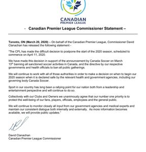 The CPL league has announced the postponement of the start of the 2020 season. Staff will be notified when the season has been resumed.